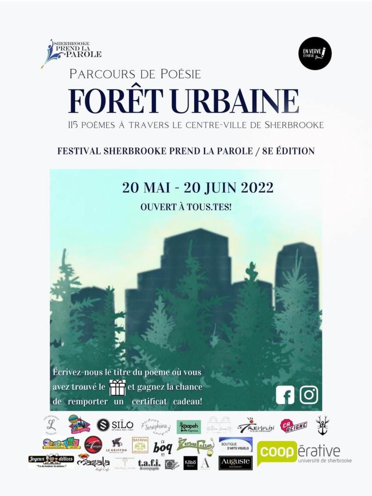Le 28 mai 2022, j’étais à Sherbrooke pour découvrir le parcours de poésie FORÊT URBAINE de la 8e édition du festival Sherbrooke prends la parole.