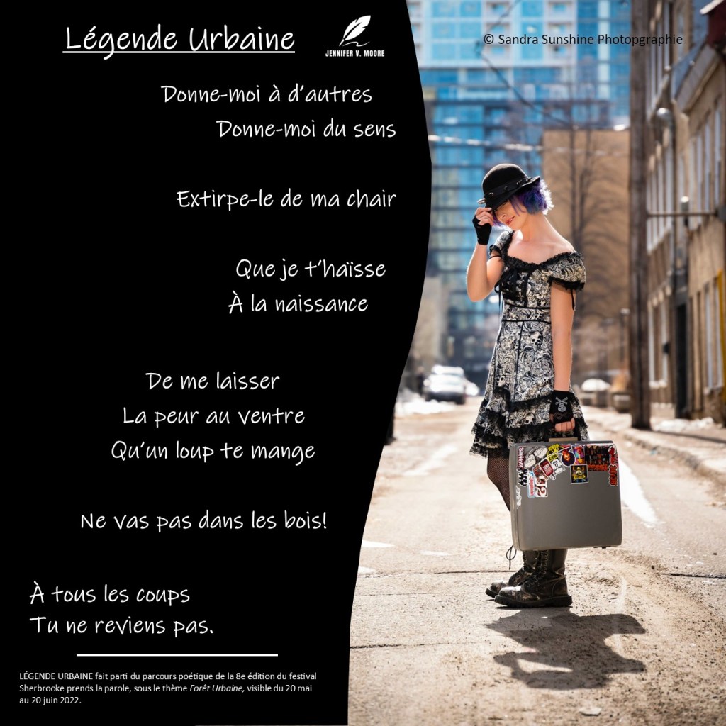 Le poème « Légende Urbaine » est visible lors du parcours de poésie FORÊT URBAINE du festival Sherbrooke prends la parole – 8e édition, du 20 mai au 20 juin 2022.