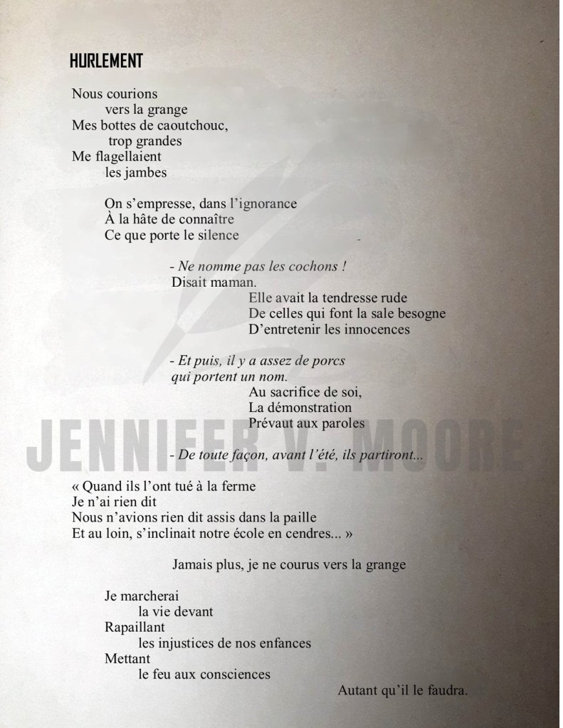 Hurlement est un poème qui se veut une réponse à l’œuvre « Le silence » de Marie-Claire Blais paru en 1967 dans le recueil Pays voilés. La revue Femmes de paroles désirait rendre un hommage à des grandes dames de la littérature disparue en 2022, soit Marie-Claire Blais, Michèle Lalonde et Mona Latif-Ghattas.