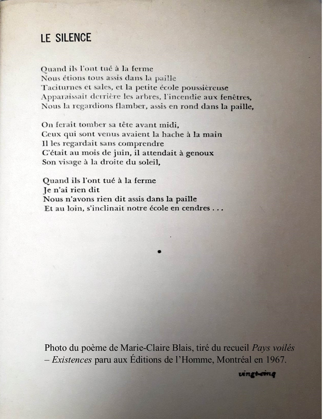 Le dimanche 26 mars 2023, à La petite marche de Montréal (5035, rue Saint-Denis) la revue Femmes de paroles, sous la direction de Annie Molin Vasseur et Nancy R. Lange, lançait son 6e numéro. J’ai eu le grand bonheur de lire ce texte entourée de femmes exceptionnelles. Il est inspiré du poème le Silence de Marie-Claire Blais. La revue désirait rendre un hommage à des grandes dames de la littérature disparue en 2022.