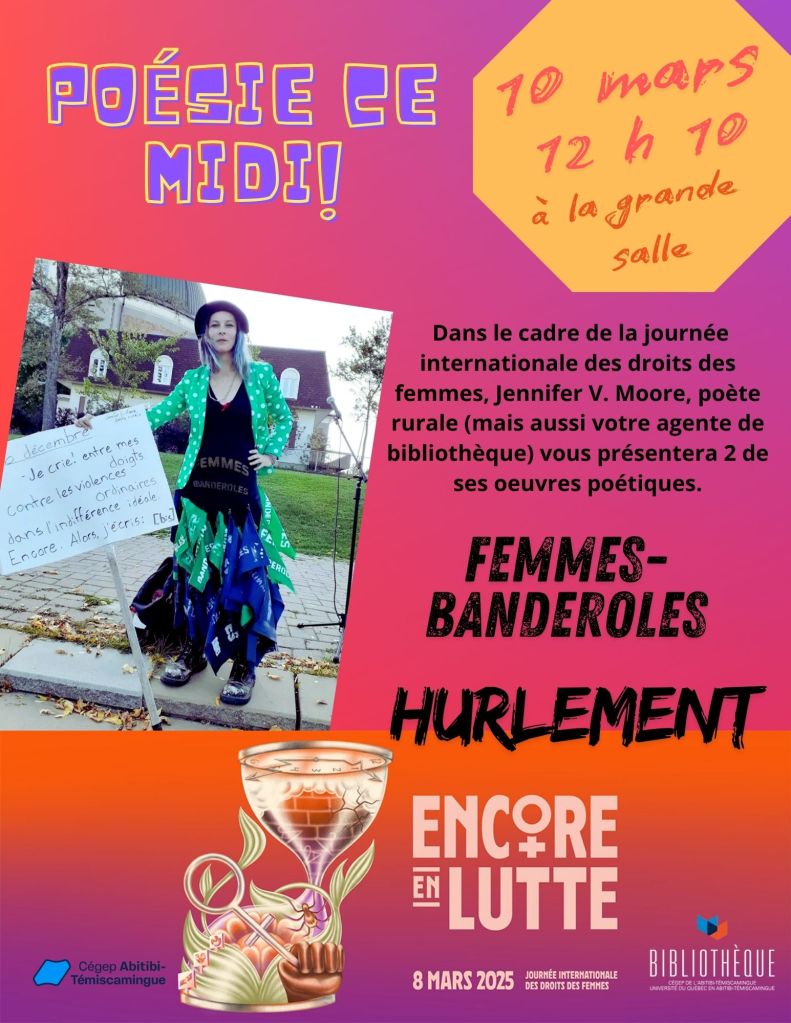 COMMUNIQUÉ – La poète abitibienne Jennifer V. Moore présentera ses œuvres intitulées « Femmes-banderoles » et « Hurlement » ce lundi 10 mars 2025, dans le cadre de la Journée internationale du droit des femmes à la Grande Salle du Cégep d’Amos.