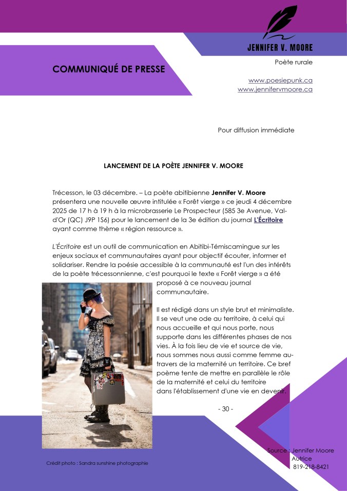 COMMUNIQUÉ – La poète abitibienne Jennifer V. Moore présentera une nouvelle œuvre intitulée « Forêt vierge » ce jeudi 4 décembre 2025 de 17 h à 19 h à la microbrasserie Le Prospecteur (585 3e Avenue, Val-d’Or (QC) J9P 1S6) pour le lancement de la 3e édition du journal L’Écritoire ayant comme thème « région ressource ».